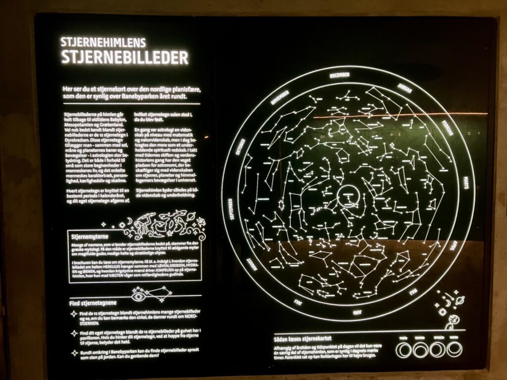 Og hvorfor nu det? Jo, for under stiens platform lyser en installation op. Den er med selveste den nordlige stjernehimmel. Vandreren kan orientere sig i årstidernes skiftende stjernebilleder, både ved at studere de lysende myriader på tavlen og ved at læse teksten. Desuden er belægningen under halvtaget dekoreret med de 12 stjernetegn.